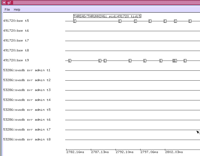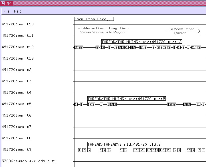 Summary mode declutters the screen by rendering events as short vertical line segments instead of numbered boxes. Event detail display is unaffected. G2 starts in summary mode, zoomed out sufficiently for all events in the trace to be displayed. Given a large number of events, summary mode reduces initial screen-paint time to a tolerable value. Once you’ve zoomed in sufficiently, type “e” - enter event mode, to enable boxed numeric event display.