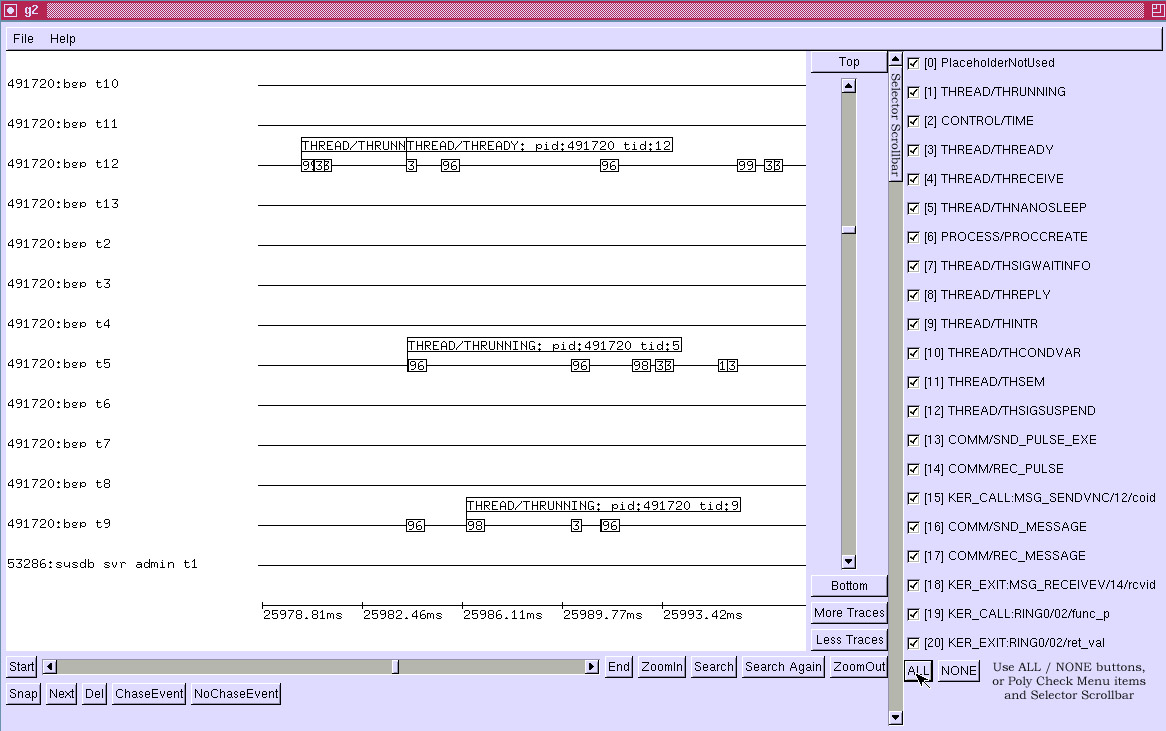 Note that event detail boxes previously shown, but suppressed due to deselection of the event code will reappear when one reselects the event code. In the example above, the “THREAD/THREADY pid:491720 tid:12” detail box appears in this fashion.