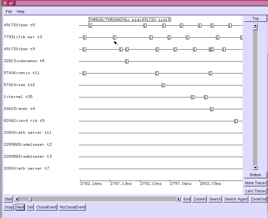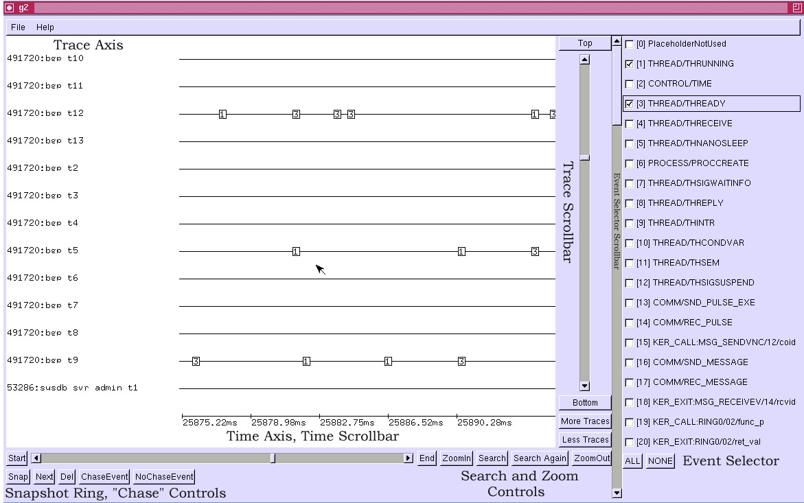 Event chasing sorts the trace axis by occurrence of the last selected event. For example, if one selects an event which means “thread running on the CPU” the first N displayed traces will be the first M threads to run (N <= M; a thread may run more than once. This feature addresses analytic problems caused by the finite size of the drawing area.